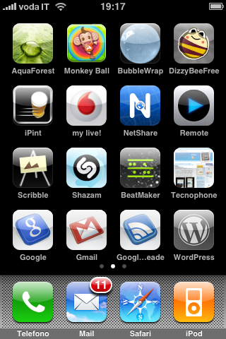 una applicazione che non deve mancare è Files. Si acquuista dall’Apple store per poco meno di 6€ e permette di far girare un WebDAV server sull’iPhone via WiFi: in sostanza si fa upload e download di file pdf, doc, xls, jpg, png, txt ed altri. E’ la sincronizzazione che manca ad iTunes!