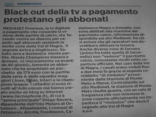 non sanno proprio cosa dire!!!! inoltre mi hanno chiesto almeno un paio di volte se avevo fatto l’abbonamento tramite loro o via internet!!! il che mi ha fatto parecchio inc…are!!! cosa c’entra in che modo mi sono abbonato sul fatto che non c’è il segnale??? poi ho capito che un cliente che si abbona per conto proprio è meno tutelato in quanto non poteva essere messo in guardia!!! ridicolo!!! sono sicuro che se mi fossi abbonato tramite loro non mi avrebbero certo informato!!! stanno cercando di limitare i danni!!! è una cosa triste! vorrei essere rimborsato! ma quanto??? non credo che un dodicesimo di 179 euro mi possa bastare!! cosa ne pensate???