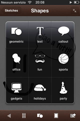 Un’applicazione davvero molto simpatica e ben fatta per disegnare al volo! Permette di scegliere dimensioni e colori del pennello e include molte forme come nuvolette, cappellini ,cuoricini e altro ancora. Permette di personalizzare lo sfondo con varie immagini (anche dalla propria galleria) e una volta eseguita la nostra opera d’arte possiamo salvarla nel programma stesso o esportarla verso il rullino fotografico o twitter. Ah, per cancellare? Semplice! Basta scuotere l’Iphone! Insomma una applicazione davvero meritevole e utile!