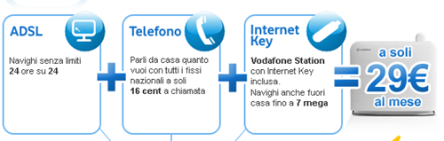 Internet KEY : Se inserita nella Vodafone station permetterà di navigare da subito tramite la connessione UMTS-HSDPA in FLAT Totale in attesa dell’ attivazione della linea ADSL vera e propria.