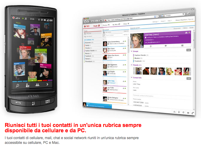 Il sito http://www.360.com è automaticamente sincronizzato con il tuo cellulare Vodafone 360. in questo modo i tuoi contatti e i tuoi contenuti sono sempre aggiornati e al sicuro, accessibili in qualunque momento da cellulare, PC o Mac.