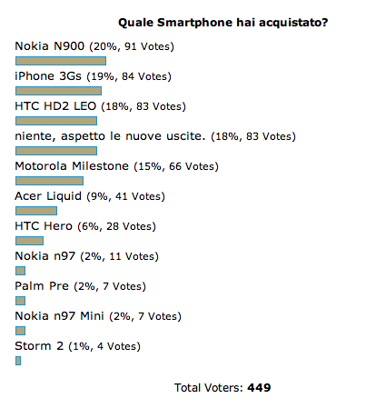Al secondo postyo si piazza l’ oramai inossidabile iPhone 3Gs (19% con 84 voti) mentre gli indecisi sono al terzo posto a pari merito con la belva HTC HD2 LEO (18% con 83 voti)