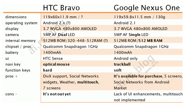 Scheda tecnica a confronto : Nexus ONe vs HTC Bravo