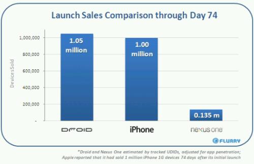 In confronto il Motorola Droid ha venduto 1.005.000 unità mentre iPhone di prima generazione 1.000.000.