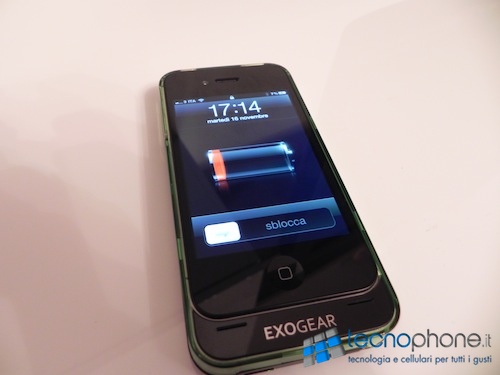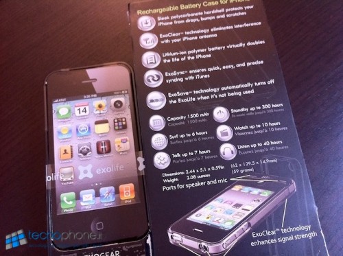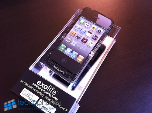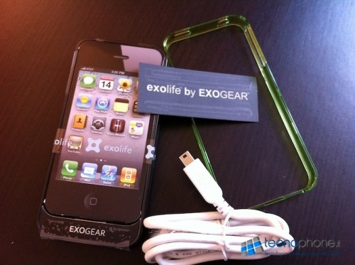 Al suo interno troviamo la custodia batteria Exolife, il cavo Mini USB per la ricarica e il collegamento al PC/Mac e una specie di Bumper per bloccare il nostro iPhone 4 nella custodia.