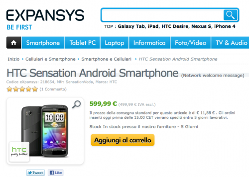 Gli amici di batista70phone segnalano la presenza di Htc Sensation nel sito di Expansys Italia.