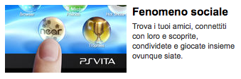 Il 27 gennaio 2011 SCE ha annunciato la prima applicazione per PS Vita, “vicino“, pre-installata sul sistema. Questa applicazione consente agli utenti PS Vita di scoprire a cosa giocano (o a cosa hanno giocato di recente) altri utenti nelle vicinanze, e di condividere informazioni di gioco tra loro. “vicino” è inoltre dotato di funzionalità di “gifting”, grazie al location gaming, che permette agli utenti di accedere a oggetti di gioco condivisi da altri giocatori, quando si trovano in luoghi geografici visitati in precedenza da altri.