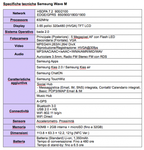 Samsung Wave M permette agli utenti di tenersi sempre aggiornati rispetto alla propria frenetica vita digitale grazie a ChatON e Social Hub. Dotato di un ampio schermo HVGA da 3.65 pollici e costituito da un corpo di vetro resistente e metallo, Wave M consente di rimanere sempre connessi con la propria comunità di riferimento. ChatON, messaggi feed semplificati, navigazione web avanzata e il supporto al Wi-Fi Direct, offrono un’esperienza unica in mobilità.