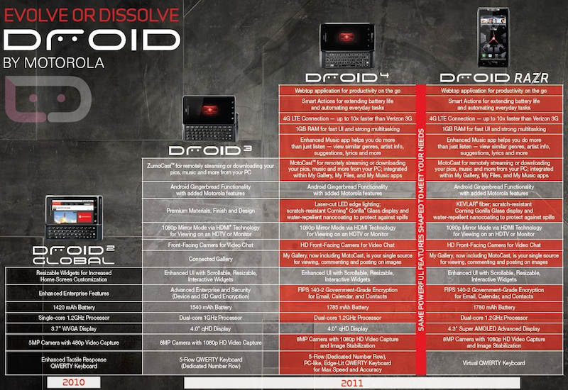 Ecco una scheda comparativa dei precedenti Motorola Droid/Milestone