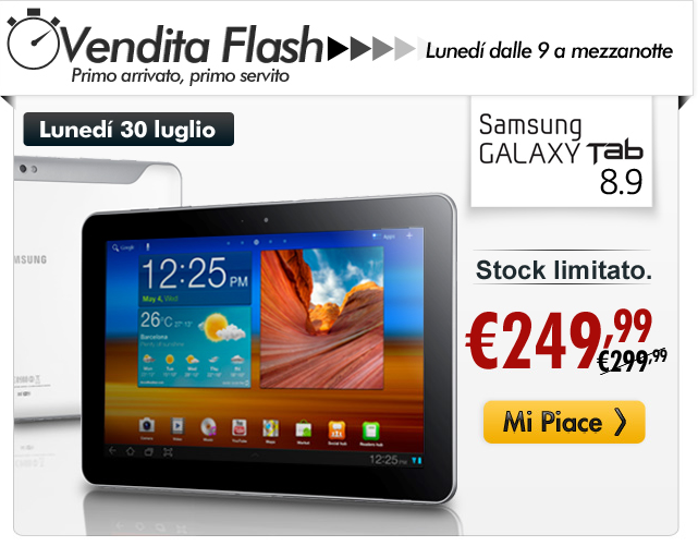 Expansys.it propone il Samsung Galaxy Tab 8.9 WiFi a soli 249 euro fino alla mezzanotte di oggi.