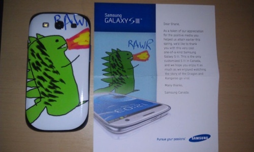 “Caro Shane, come segno del nostro apprezzamento per il positivo riscontro mediatico che ci hai aiutato ad ottenere la scorsa primavera, vorremmo ringraziarti con questo bellissimo e unico nel suo genere Samsung Galaxy S III. Questo è il solo Galaxy S III personalizzato di tutto il Canada, e speriamo che ti piaccia almeno tanto quanto è piaciuto a noi guardare la storia del drago e del canguro che diventava virale. Tante grazie, Samsung Canada.”