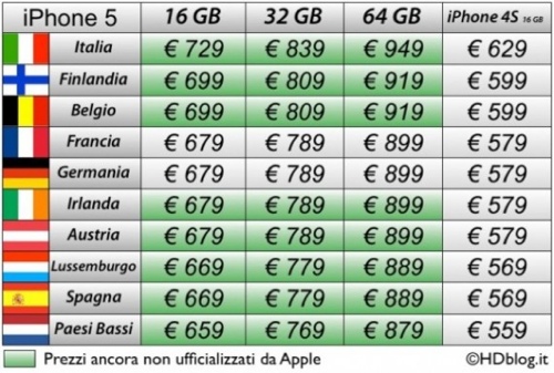 Di seguito una tabella realizzata dai ragazzi di HDblog che mostra i prezzi del nuovo IPhone 5 nei vari paesi:
