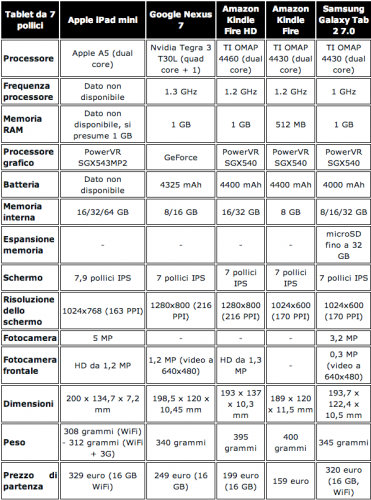 La redazione di tomshw ha pubblicato una tabella molto interessante che ci mostra tutte le caratteristiche tecniche di ben cinque tablet da 7 pollici.
