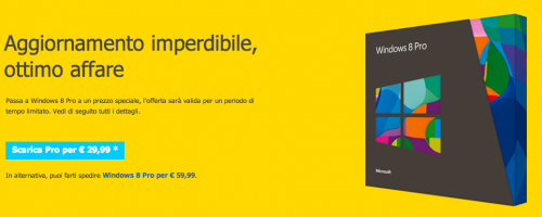 Oltre all’ampia scelta di nuovi dispositivi, i clienti avranno poi la possibilità di aggiornare a Windows 8 i propri PC. Fino alla fine di gennaio, i PC con sistema operativo Windows XP, Windows Vista o Windows 7 potranno effettuare l’upgrade a Windows 8 Pro grazie alla versione pack DVD di aggiornamento, disponibile presso i migliori rivenditori al prezzo di 59,99€, oppure scaricando la versione online all’indirizzo windows.it al prezzo di 29,99 €. Tutti gli utenti che hanno invece acquistato un PC Windows 7 tra il 2 giugno 2012 e il 31 gennaio 2013 potranno usufruire della Windows Upgrade Offer, effettuando l’aggiornamento a Windows 8 Pro al prezzo di 14,99 € all’indirizzo http://www.windowsupgradeoffer.com.