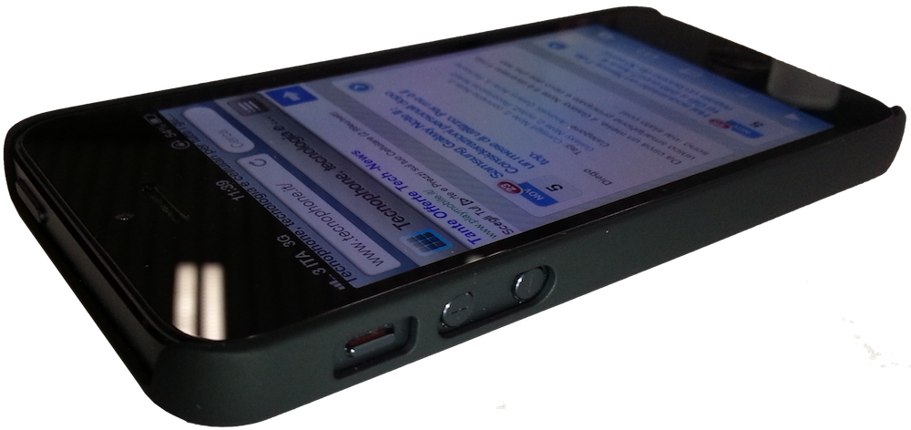 Nella versione arrivata in redazione il retro della cover è coperto da una lamina con effetto fibra di carbonio, flessibile e resistente. Inoltre, le foto non riescono a rendere il movimento che questo materiale da’ alla cover grazie ai riflessi delle fibre. Nulla a che vedere con gli adesivi prestampati di fibra che si trovano in giro.
