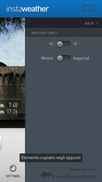 InstaWeather funziona come instaPlace, ma oltre a mostrare il nome della località, ci mostra anche la situazione meteo attuale.