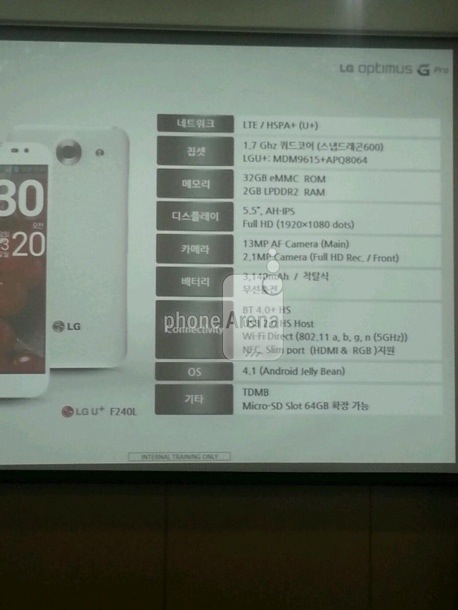 In rete è spuntata da pochissimo una foto ritraente il nuovo LG Optimus G Pro il primo dispositivo Full HD di LG! Vediamo di seguito le immagini e le caratteristiche Hardware complete:
