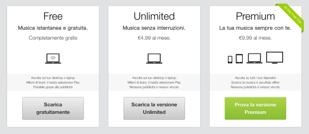 - Premium : Tutto il catalogo ascoltabile senza pubblicità, senza limiti di ascolto e possibilità di scaricare i brani per un ascolto offline. Solo con l’ account premium si possono usare le applicazioni per dispositivi mobili.