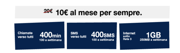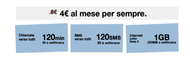 L’offerta è proposta ad un prezzo promozionale ai Clienti che effettuano la portabilità del numero. Nel caso in cui il numero portato dovesse essere stato già attivo sulla rete 3 nei 60 giorni precedenti all’attivazione o nel caso in cui la portabilità del numero non andasse a buon fine, 3 si riserva la facoltà di applicare il prezzo intero, previa comunicazione al Cliente.