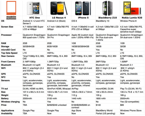 Ovviamente quando un dispositivo Top di gamma viene lanciato la prima cosa ovvia da fare è quella di confrontare le caratteristiche tecniche dello stesso con quelle degli attuali top di gamma già sul mercato, vediamo allora una tabella molto interessante che comprende le specifiche di: HTC One, LG Nexus 4, Apple iPhone 5, BlackBerry Z10 e Nokia Lumia 920