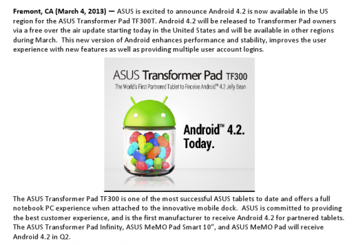 Ogni volta che una nuova versione di Android esce le case madri hanno un grande lavoro da svolgere per adattare i nuovi firmware alle loro personalizzazioni ed il piu’ delle volte passano mesi prima di averne una release. Da qualche mese è disponibile la versione 4.2 di Android per dispositivi Nexus e da allora un po’ tutti abbiamo iniziato a chiederci: chi sarà la prima “casa” ad aggiornare un dispositivo non Nexus? La risposta è Asus!