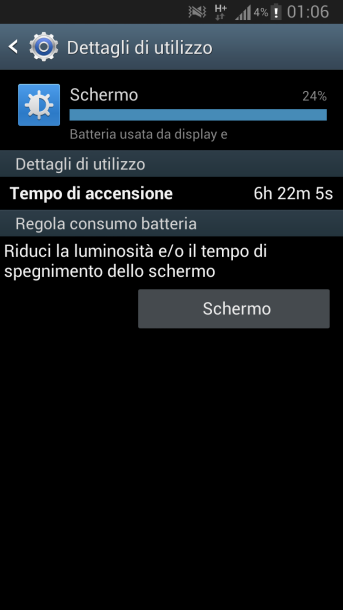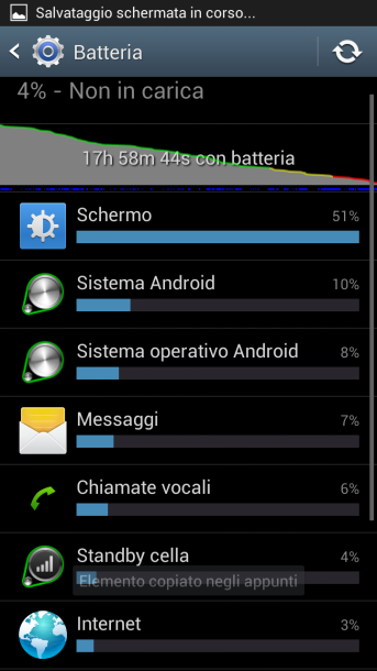 Ultimate le 5 cariche di assestamento questo screenshoot è stato effettuato alla fine di una giornata con uso intenso (mail in push, navigazione internet, giochi, 500mb di dati scaricati via wi-fi, una 50ina di messaggi via whatsapp, 80 sms circa e mezzora di telefonate totali). Il telefono è stato staccato dalla presa di corrente alle ore 9 circa per poi morire poco dopo questo screenshot.