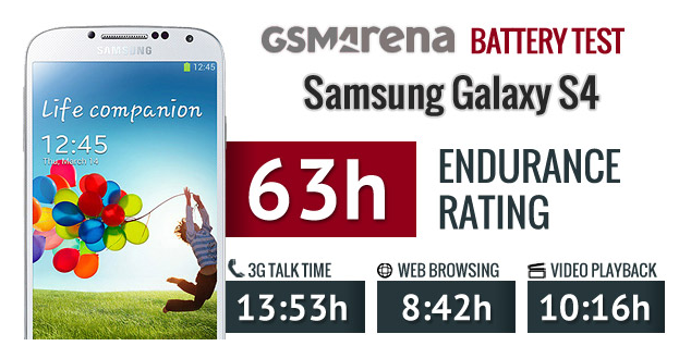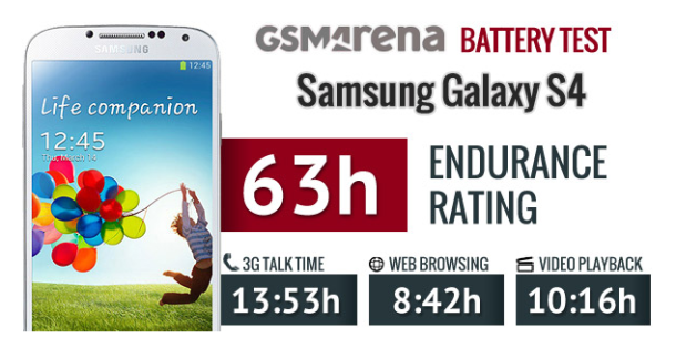 GSMArena ha pubblicato il risultato di test approfonditi sulla durata della batteria (che vi ricordo è da 2600 mAh) del nuovo Samsung Galaxy S 4.