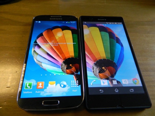 Vi basta accendere l’ampio display da 5″ Full HD Super Amoled per capire che qui non si scherza, i colori sono davvero molto vivi e forti (se impostate la modalità naturale dalle impostazioni dello schermo diventano molto piu’ reali) e l’angolo di visuale è uno dei suoi punti di forza. Con la precedente generazione di pannelli Super Amoled i problemi principali erano 3, ovvero: luminosità bassa, bianchi tendenti all’azzurro e visibilità al sole veramente ridotta. Bene io ho fatto delle prove e posso dirvi che la luminosità da punto debole è passato a punto a favore perchè è veramente alta, di seguito una foto comparativa con Xperia Z (tutti e due i display a luminosità massima):