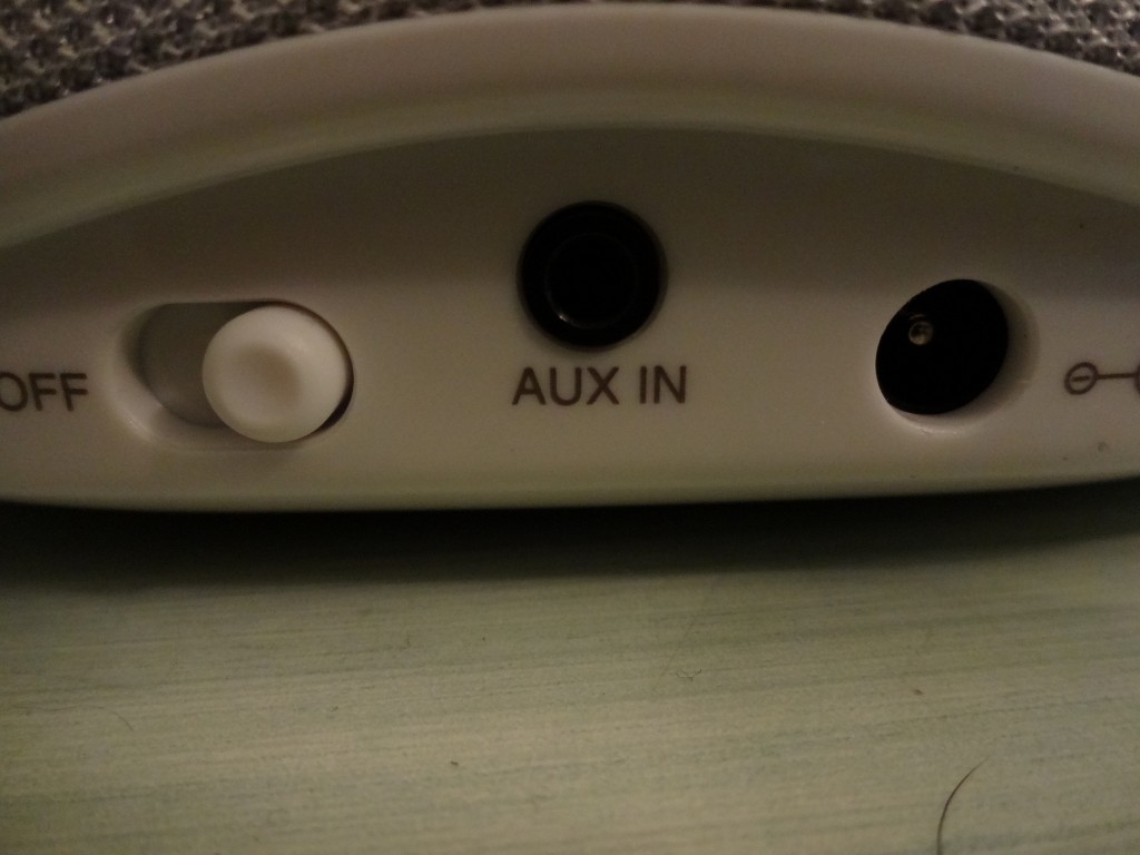 Dietro troviamo: switch di accensione e spegnimento, ingresso AUX (per pc, mp3 o qualsiasi fonte audio che non disponga di bluetooth) ed entrata per il caricatore