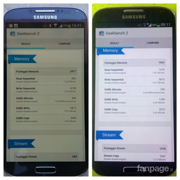 Come ben saprete esistono due varianti di Samsung Galaxy S4: una con processore Snapdragon 600 Quad-Core 1,9Ghz I9505 ed una Exynos Octa-Core 1,6 Ghz I9500. La domanda che la maggior parte degli utenti si pone è: quanta differenza prestazionale esiste tra le due versioni? Gli amici di Mobile Fanpage sono riusciti ad averle entrambi tra le mani ed hanno effettuato alcuni Benchmark, vediamoli:
