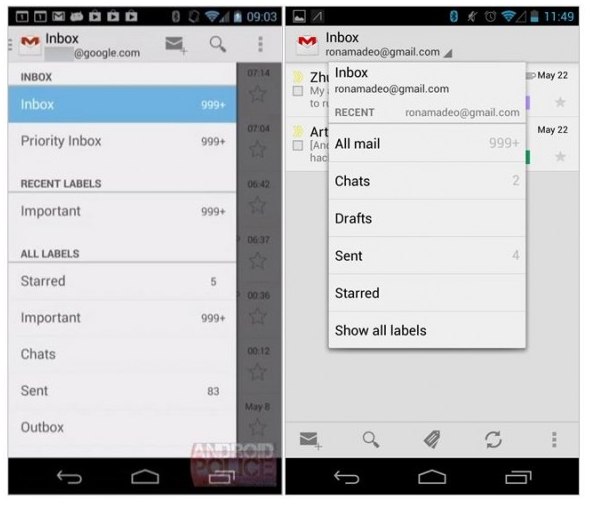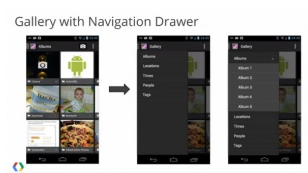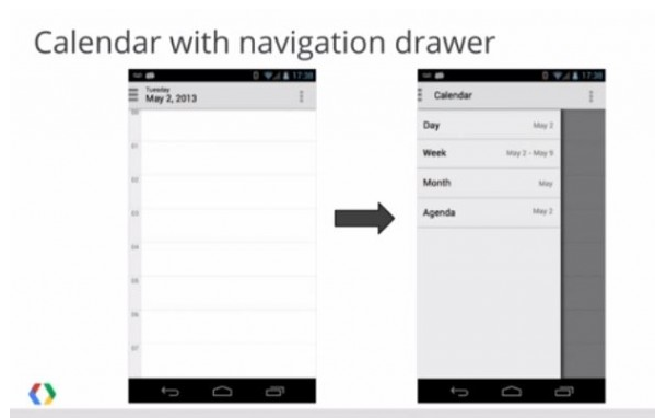 Durante la conferenza Google I|0 2013, Google ha introdotto la nuova sidebar laterale, richiamabile attraverso i 3 puntini in alto a sinistra oppure con uno “swipe” da sinistra verso destra. (provate con l’ app Google Drive)