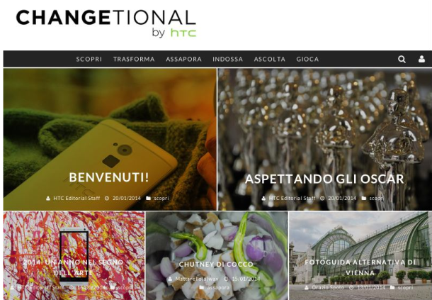Scopri, trasforma, assapora, indossa, ascolta e gioca sono le 6 categorie nelle quali si declina Changetional: dalla moda, al food, passando per il design e la fotografia, senza dimenticare musica, arte, cinema, travel e curiosità dal mondo. HTC crea una finestra digitale per dare voce alle passioni; saranno i contenuti degli smartphone i veri protagonisti. I viaggi, le immagini, le esperienze, gli interessi, le avventure che essi custodiscono e permettono di condividere.Changetional racconterà l’universo di emozioni e il susseguirsi di sogni che le ultime innovazioni tecnologiche possono trasformare in realtà.