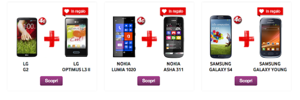Fino al 15 Febbraio 2014, se si acquista uno smartphone 4G tra quelli in promozione ( LG G2, Nokia Lumia 1020 e Samsung Galaxy S4) , arriverà via mail uno buono che ci permetterà di riscuotere un secondo smartphone in omaggio!