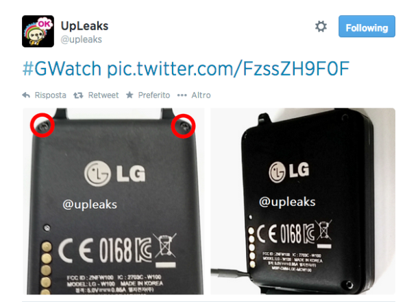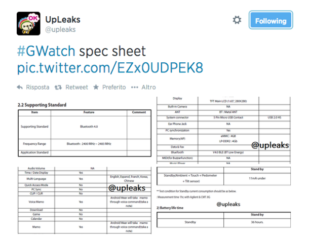 Arrivano dall’ account twitter UpLeaks le specifiche tecniche del nuovo LG G Watch.