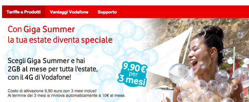 Vodafone Italia ha ufficializzato la nuova promozione GigaSummer, 2 GB di traffico dati al mese (anche in 4G) per 3 mesi al prezzo di 9,90 euro.
