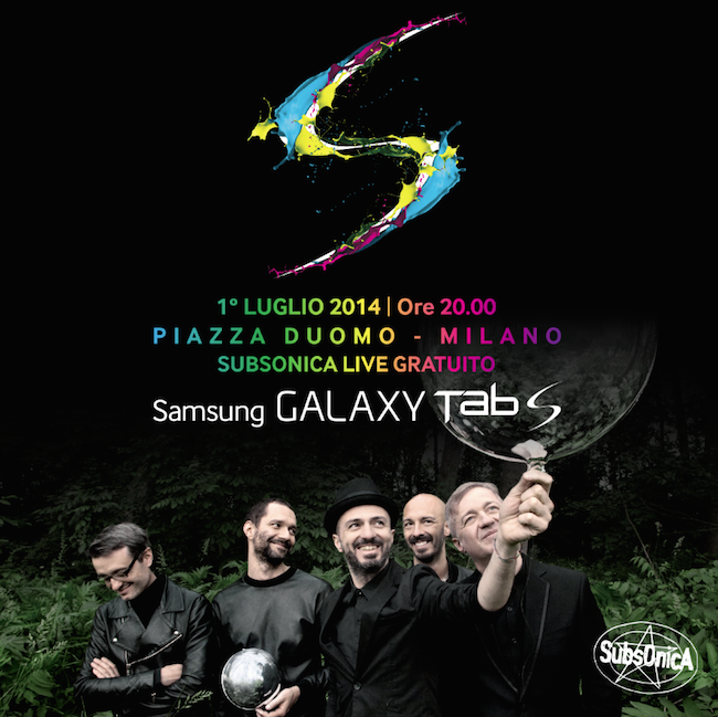 Martedì 1 luglio, i SUBSONICA saranno i protagonisti di un esclusivo evento gratuito che accenderà Piazza Duomo a Milano. Grazie a Samsung e ai nuovi Galaxy Tab S, i tablet più sottili e leggeri del mercato, Milano vivrà con i SUBSONICA una serata di musica rigorosamente live e il grande pubblico potrà ascoltare per la prima volta dal vivo anche Lazzaro -primo singolo del nuovo album in uscita a settembre – e ballare sulle note dei loro più grandi successi.
