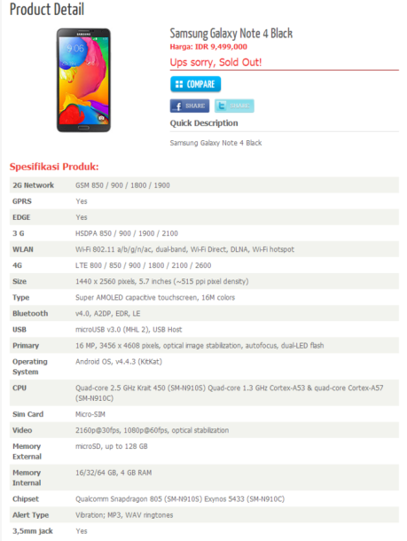 A circa tre settimane dalla sua presentazione ufficiale di Berlino (3 Settembre), spunta il Galaxy Note 4 in un e-shop Indonesiamo, con tanto di foto ufficiale e scheda tecnica.