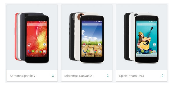 I primi tre dispositivi Android One sono Karbonn Sparkle V, Micromax Canvas A1 e Spice Dream Uno, i tre dispositivi condividono stesso hardware e saranno venduti con Android 4.4.4 a meno di 100€.