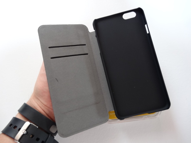 All’interno troviamo due vani porta carte di credito, che possono essere utilizzati anche per trasportare banconote o documenti. Il tutto è rivestito da morbido velluto che impedisce di rigare il display e lo protegge.