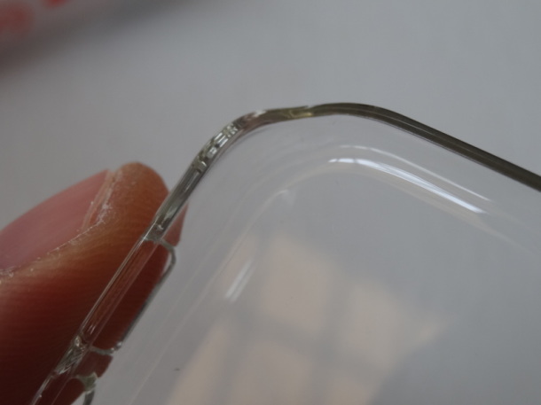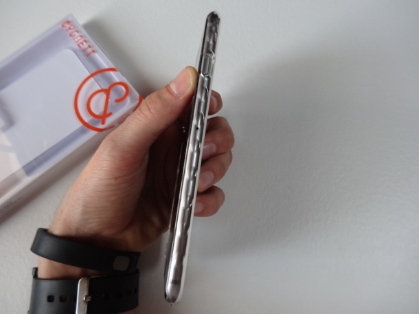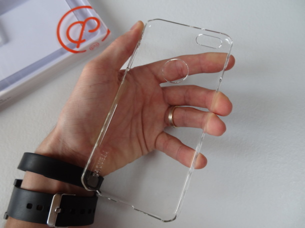 La cover è in policarbonato trasparente ed ha la particolarità di avere delle feritoie ai lati che offrono una maggiore presa.
