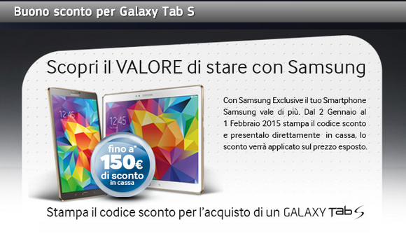 150 euro di sconto sull acquisto di un tablet della famiglia Galaxy Tab S per i modelli LTE e 100 euro per i modelli solo WiFi.