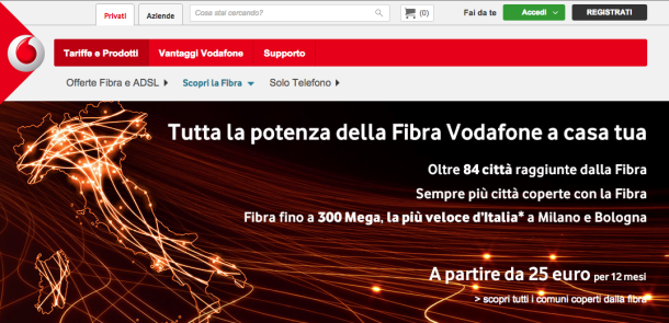 Vodafone investe in Italia 3,6 miliardi di euro per portare la banda larga mobile e fissa alle famiglie e alle aziende di tutta Italia: sono già 84 le città raggiunte dalla Fibra ottica Vodafone, frutto della realizzazione di oltre 3200 cabinet su tutto il territorio nazionale. Vodafone è stato inoltre il primo operatore a lanciare in Italia la Fibra a 300 Mbps, disponibile a Milano e Bologna con tecnologia Fiber to the Home (FTTH).