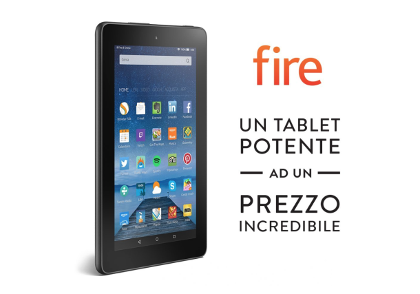Il nuovo tablet Fire include processore quad-core, schermo IPS da 7”, fotocamere frontale e posteriore, memoria d’archiviazione espandibile fino a 128GB, funzioni e servizi esclusivi di Amazon, e accesso all’ecosistema di contenuti Amazon, tutto a soli 59,99€.