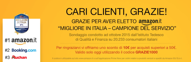 Amazon festeggia il primo posto nella speciale classifica “servizio ed esperienza offerta” offrendo a tutti i clienti uno speciale sconto di 10 euro valido con un per tutti gli acquisti superiori a 50€.