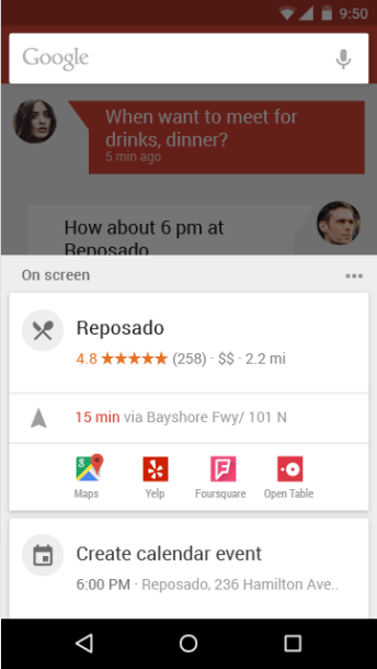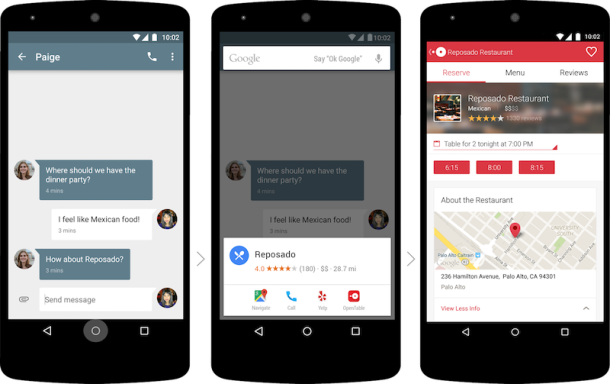 Se siete in chat con una vostra amica e state decidendo dove andare a cena, Google vi può aiutare a trovare rapidamente informazioni sul ristorante che vi è stato suggerito. Potrete anche avere accesso ad altre app sul vostro telefono come OpenTable o Yelp, in questo modo potrete facilmente effettuare una prenotazione, leggere le valutazioni di altri clienti o ancora dare un’occhiata al menù.
