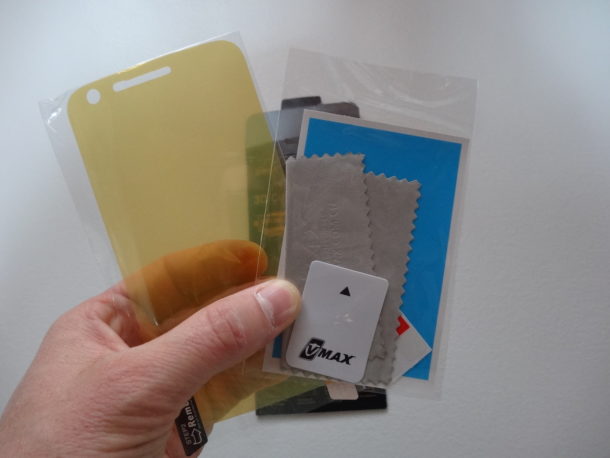 Nella confezione troviamo il panno per pulire il display, l’adesivo per rimuovere eventuali residui di polvere e il cartoncino per rimuovere le bolle d’aria.