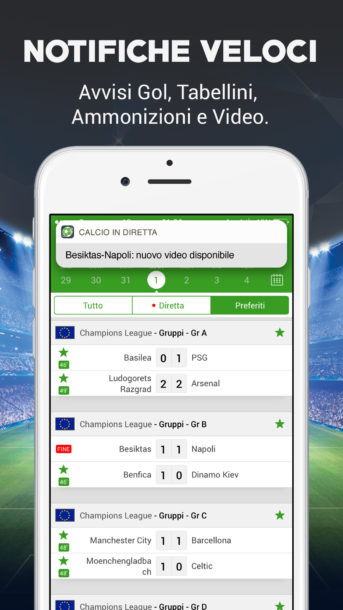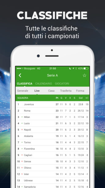 Le notifiche sono molto veloci per tutto quello che riguarda video delle reti, ammonizioni o espulsione e avviso su un gol realizzato. Le statistiche complete: formazioni, highlights, calendario e commenti. I risultati in diretta su più di 1000 campionati, conditi da classifiche prontamente aggiornate. Se vi piace seguire il calcio, questa è l’applicazione fatta per voi!