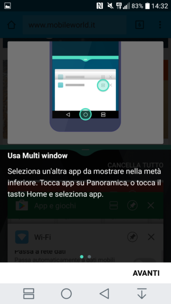 Nel multitasking è possibile bloccare un’app in modo che rimanga sempre in background ed è possibile utilizzare la funzione multischermo, per visualizzare due applicazioni in una schermata unica.