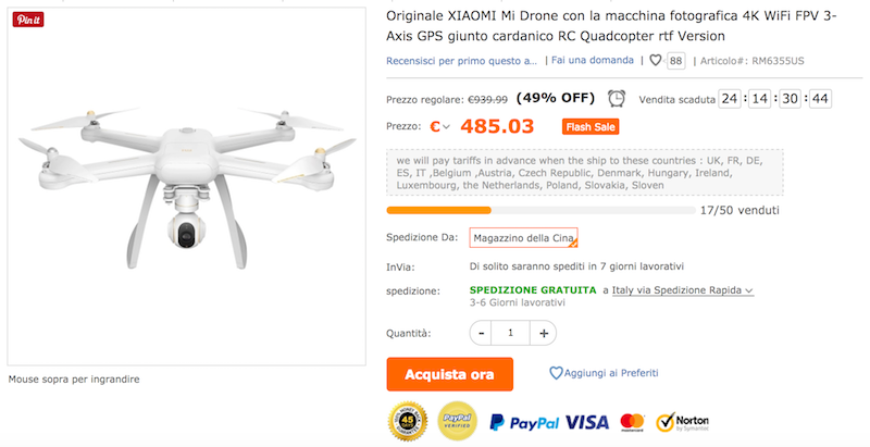 Il drone è originale Xiaomi, le tasse doganali sono pagate in anticipo dallo shop.