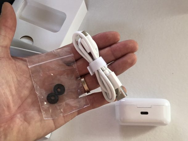 La scatoletta di cartone contiene, oltre agli auricolari con il box, un cavo USB Type C per la ricarica e un paio di gommini in ear di ricambio.